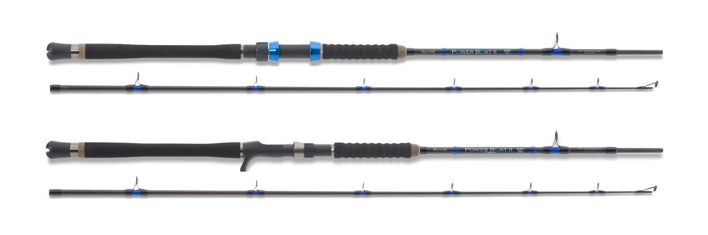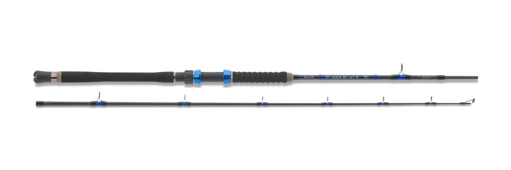 Mit der Aquantic Power Boat II sind wieder echte Arbeitstiere entstanden, welche über extrem hohe Kraftreserven bei überraschend geringem Eigengewicht verfügen. Ein gerillter Vorgriff bietet zusätzlichen Halt zur Unterstützung bei einem intensiven Drill. Wenn Gimbals bzw. Bauchgurte zum Einsatz kommen sollen ist natürlich ein Kreuzabschluss an den Ruten verbaut. Zudem wurden moderne K-type Ringe mit blauer SIC-Einlage verwendet. Ein edles EVA-Handteil rundet das hervorragende Erscheinungsbild der Inliner Power Boat II Serie ab. Neu ist, dass es nun auch ein 30lb Modell mit Trigger-Griff in der Serie gibt.