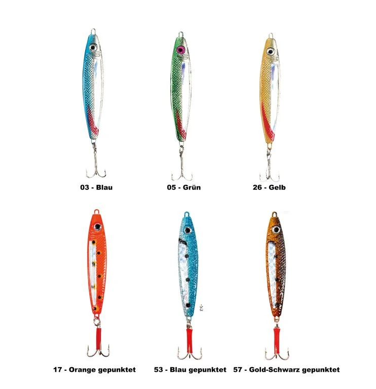 Dieser Pilker ist bleifrei. Er ist in sechs Farben und 6 verschiedenen Gewichten verfügbar. Er ist in den Farben Blau-Silber, Grün-Silber, Gelb-Silber, Orange gepunktet, Blau gepunktet und Gold-Schwarz gepunktet lieferbar. Die Gewichte gehen von 30g – 200g.