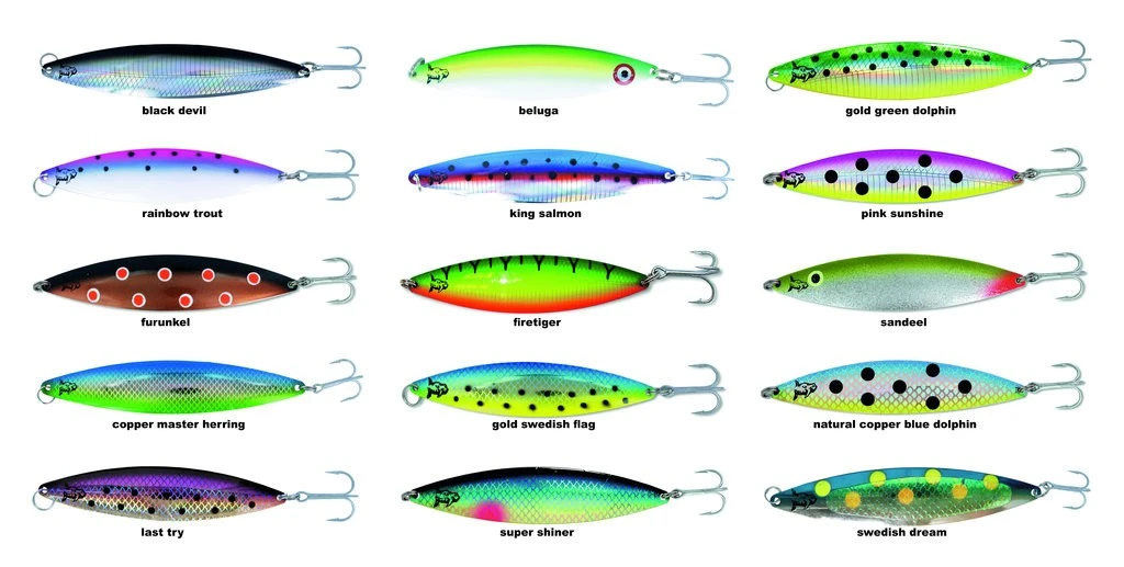Grün und Neon Gelb auf Gold ist häufig der Gewinner in stark beangelten Revieren. Die etwas dezenteren Farben fangen von der Oberfläche bis 15 Metern Tiefe bei sonnigem Wetter.