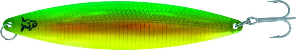 Grelle Farben verführen oft die großen Laichlachse zum Anbiss. Durch das UV-aktive Gelb ist der Köder an der Oberfläche und am Downrigger gleichermaßen einsetzbar.